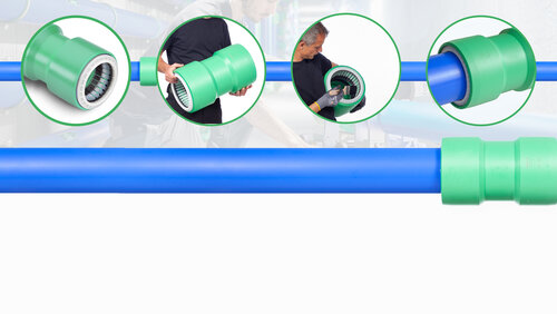 Highest safety in a few minutes: This is offered by the new aquatherm push-fit fitting, which represents a simple, fast and at the same time safe connection, exclusively for aquatherm blue pipe piping systems in air conditioning, refrigeration, heating and plant engineering. Compared to the electro socket welding process, pipe connections can be made up to 40 % faster with the aquatherm push-in socket. In addition, the tooling requirement is significantly lower.