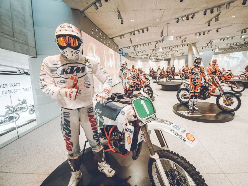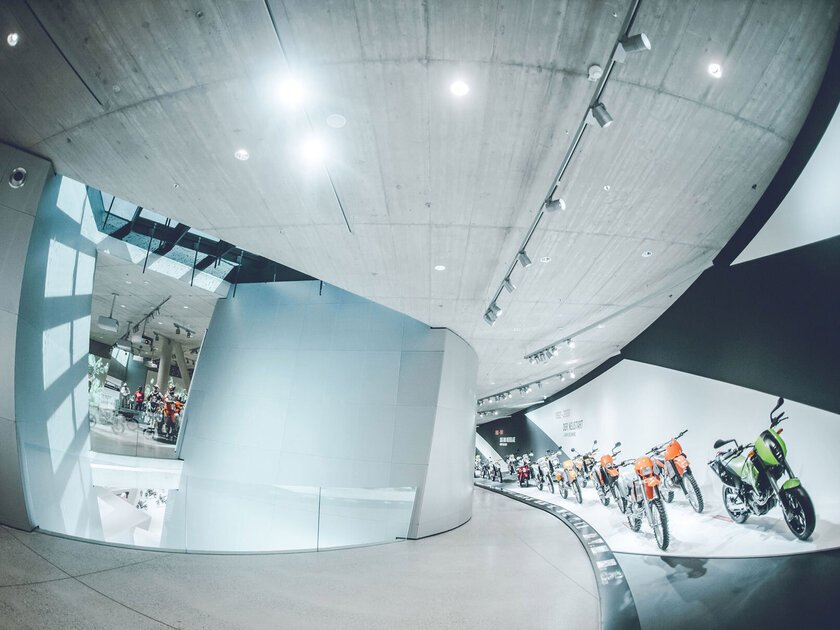 On 2600 square meters and three levels, the fascination of KTM can be experienced up close in an ultra-modern exhibition – and all that with interactive displays, virtual tours and lots of original machines. The safety of the visitors is ensured by a sprinkler system which, due to its special properties, blends invisibly into the spectacular architecture of the building.