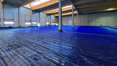 Another important component of the climate concept is the activation of the concrete core: In this special form of underfloor heating, the entire volume of the approximately 20-centimetre-thick concrete slab of the new logistics hall is used for heating and cooling. This ensures an even temperature and also saves energy. Aii – Industrieboden- und Instandsetzungs GmbH is building a total of 10,000 square metres of absolutely joint-free industrial flooring. Once again, the aquatherm blue piping system will be used, which will be installed with the Tichelmann installation and ensure even heat distribution. The system is also used in the workshop and office wing on an area of around 3,000 square metres.