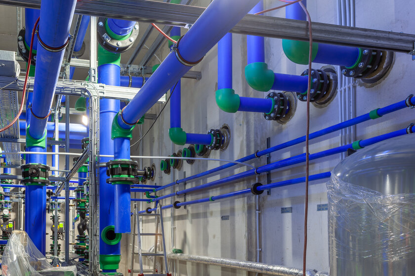 The aquatherm blue piping system, made from the corrosion-resistant plastic polypropylene (PP), is characterised by its high level of self-insulation - particularly compared to thin-walled metal pipes. This means that aquatherm blue is less prone to condensation formation at low temperatures on the source side, as is the case with the system in Soest. "In addition, the complex control technology requires the installation of many temperature sensors. This is easy to achieve with aquatherm blue using weld-in saddles - with other systems, a T-piece has to be placed every time," explains Frank Euteneuer, Managing Director Sales at Metternich Haustechnik. "Additionally, it simplifies processing enormously that we are dealing with only one material and one system across all pipe dimensions."