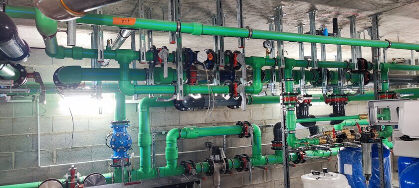 BE Fluide Artélia installed the piping system with diameters ranging from 20 to 160 mm. The company selected this product for its quality, reliability, and lightweight properties. They also took advantage of aquatherm’s prefabrication capabilities: various pipe bends between 75 and 160 mm were pre-produced at the factory and delivered to the construction site ready for installation, significantly saving time.