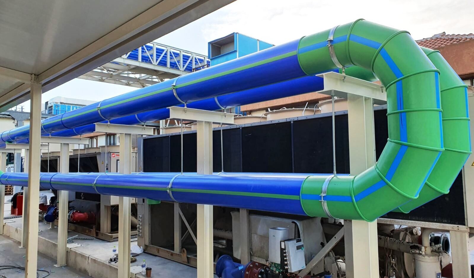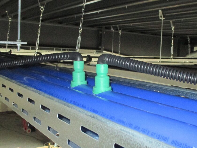 The supply line between the individual registers was made with the help of a connecting corrugated tube and a plug-in connector. The corrugated pipe allows for a flexible but unobtrusive connection, while the quick connector with safety clip creates a completely tight but still detachable connection. The connection of the surface heating and cooling system was realised via Tichelmann manifolds made of aquatherm blue pipes in the dimension 50 millimetres. aquatherm blue, also made of the plastic polypropylene, is a specialist for the transport of cooling and heating media in closed systems and is therefore particularly suitable for a wide range of industrial applications. The Tichelmann distributors were installed in cable ducts on the ceiling and prefabricated in the aquatherm factory. The outlets were installed vertically upwards in alignment so that the connection could be made quickly and easily.