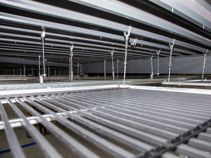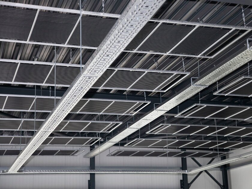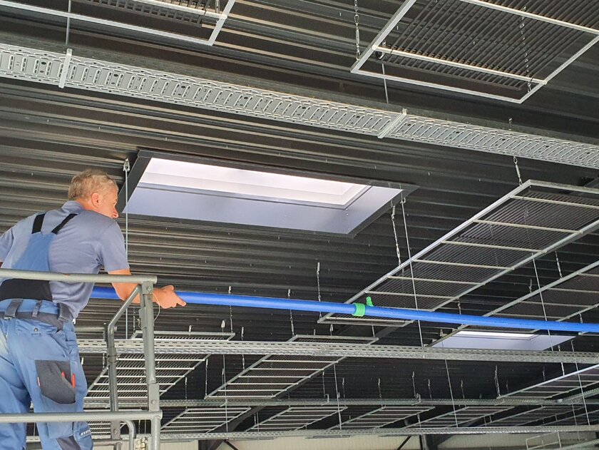 The building services wholesaler decided to mountaquatherm blackvisibly on steel frames suspended from the hall ceiling clad with black trapezoidal sheet metal. This type of installation achieves a higher efficiency and responsiveness than, for example, installation as a ceiling sail or in a closed ceiling, because in addition to a high radiant component with regard to heat transfer, the convective component also increases. The aquatherm black registers were produced according to customer requirements in a size of 1 x 3.75 m in the main factory of the aquatherm group of companies and installed in a total of 35 steel frames. For the executing company Börger from Lennestadt, which has been processing aquatherm products for over 20 years, it was the first project with this type of installation.