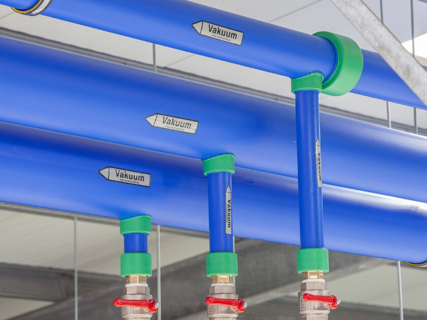 The vacuum range below a few millibars, (i.e., at a pressure well below atmospheric pressure), requires special properties from a pipeline system. The aquatherm blue that was used consists of the material fusiolen® PP-RCT. Compared to other types of polypropylene, this is characterized by increased compressive strength at higher temperatures. This makes vacuum piping even safer, and also lends itself well to areas of application such as high-pressure risers, district heating networks and industrial process systems.