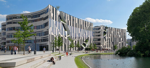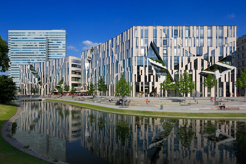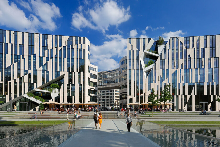 The Kö-Bogen I by star architect Daniel Libeskind has become a landmark in the heart of Düsseldorf near Königsallee. Behind its façade of glass and white natural stone, which is broken up with diagonal cuts, or “cuts,” is a mix of high-end shopping, dining and office space. Two 26-meter-high buildings offer a floor area of approx. 42,000 m². Due to its sustainable construction, Kö-Bogen I has received LEED Platinum certification.