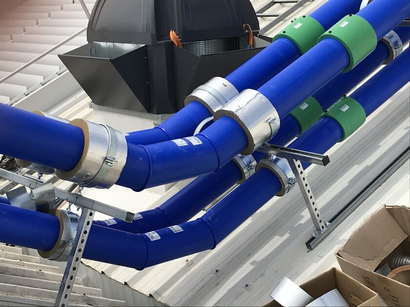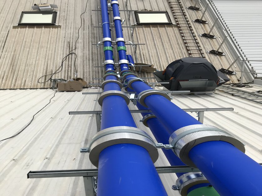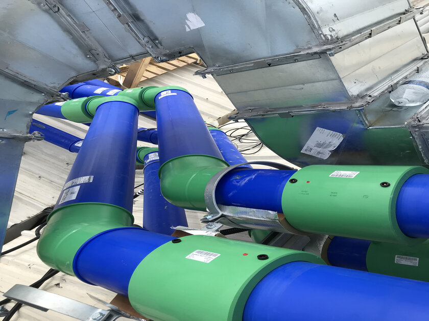 As part of the renovation, the aquatherm blue piping system was used for both the hot and cold water distribution. Available in two different diameters – 160mm for heating, 200mm for cooling – it ensures the safe transport of water in the closed heating and cooling system. It is made of corrosion-resistant polypropylene plastic, which is characterised by high temperature and pressure resistance. Due to the exceptionally good welding properties, the pipe and fitting merge into a homogeneous, material-cohesive unit. This ensures the highest level of safety and service life.