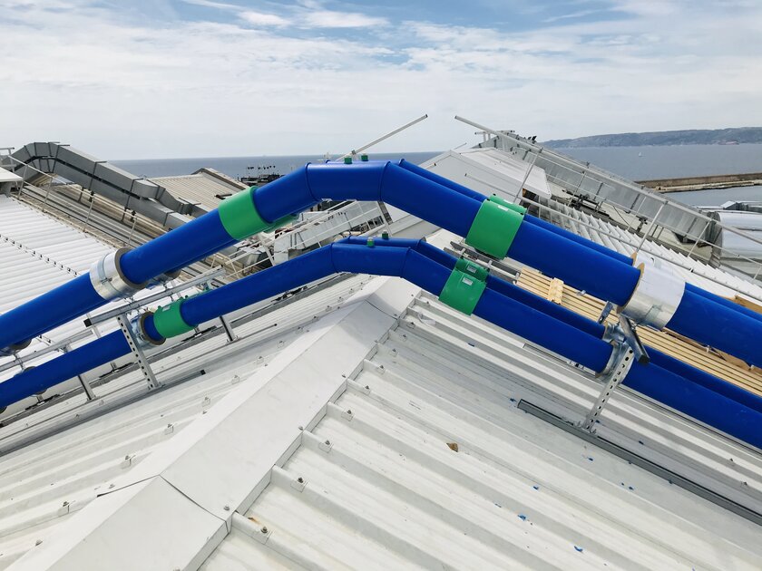 The special feature of the "Les Docks de la Joliette" project is that the hot and cold water networks are distributed on the roof. The reason for this is that there was not enough space inside the historic buildings for the installation of the piping. Roof mounting provided the installers with sufficient leeway. To protect against external influences, aquatherm blue was insulated after installation.