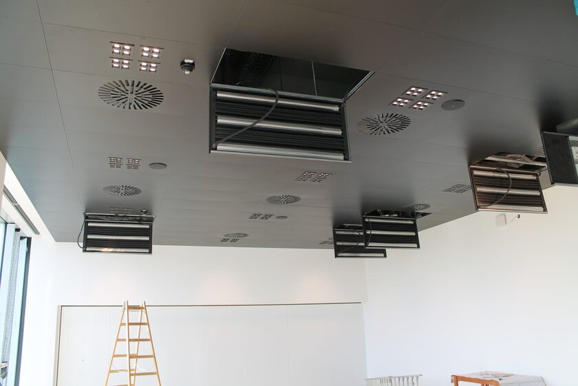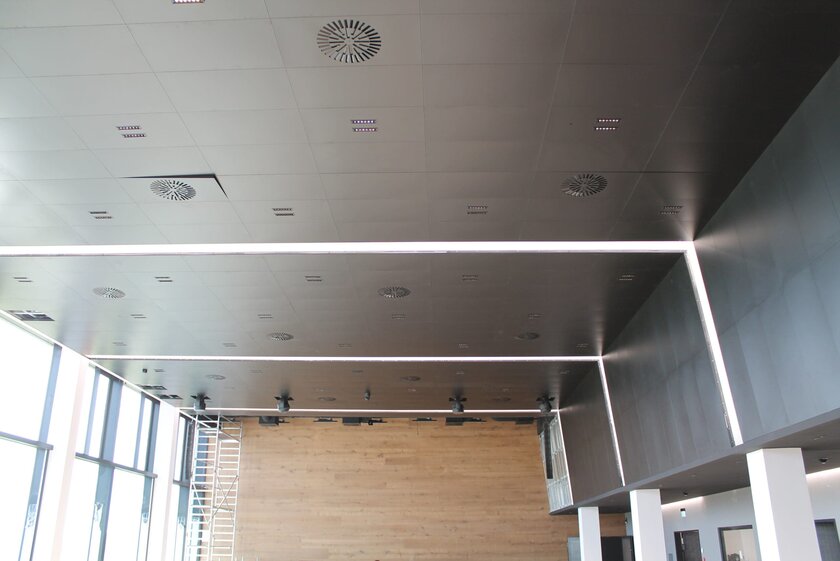 explains Jürgen Schmidt, managing director of Ingenieurbüro Schötz GmbH in Dietmannsried. The surface heating and cooling system, which is manufactured in a register design from the corrosion-resistant material polypropylene, was fitted precisely into metal cassette ceilings with acoustic fleece, each measuring 125 x 62.5 cm, over an area of around 1,100 m². Depending on requirements, the surface temperature of the registers is driven a few degrees above or below the existing room temperature. This ensures a rapid exchange of radiation that generates heat or cooling without disturbing drafts and dust swirls.