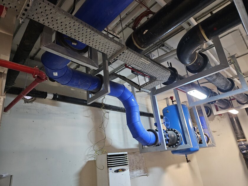 For the building's cooling system, the aquatherm blue piping system, made of polypropylene, was chosen. It ensures efficient cooling, is corrosion-free, resistant to incrustation, low-maintenance, and helps reduce construction time through fast connection technology. During installation, the pipe and fitting are briefly heated with specialised tools and then joined together. This process creates a homogeneous, material-locking unit that provides double safety at the typically critical connection point of the piping system.