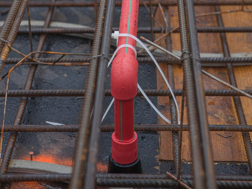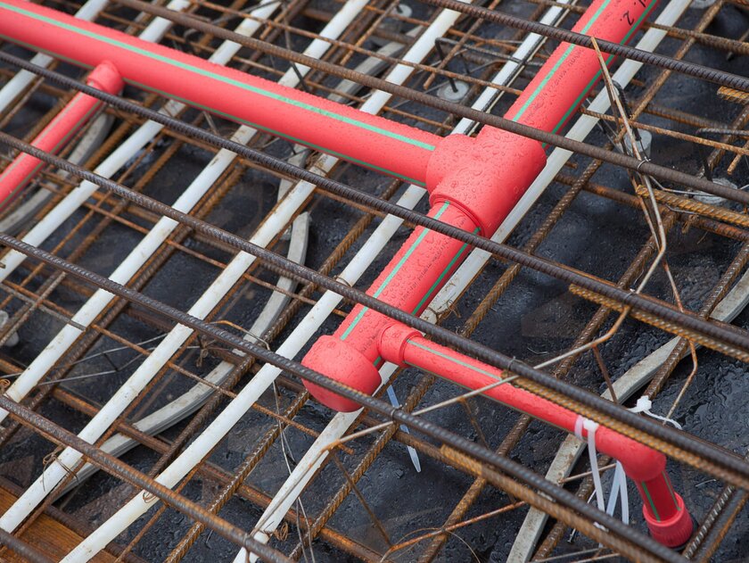 The laying in concrete is made possible by the special material: aquatherm red pipe consists of the plastic polypropylene, specifically of the material fusiolen® PP-R FS developed by aquatherm. This material offers a high degree of safety due to its flame-retardant properties (building material class B1) and its corrosion resistance. For comparison: Metal sprinkler systems can only be installed in concrete using special protective measures. The reason for this is corrosion, which inevitably occurs when metal and moist concrete meet. The special protection of metal pipe systems makes installation in concrete complex and expensive.
