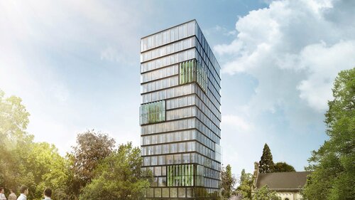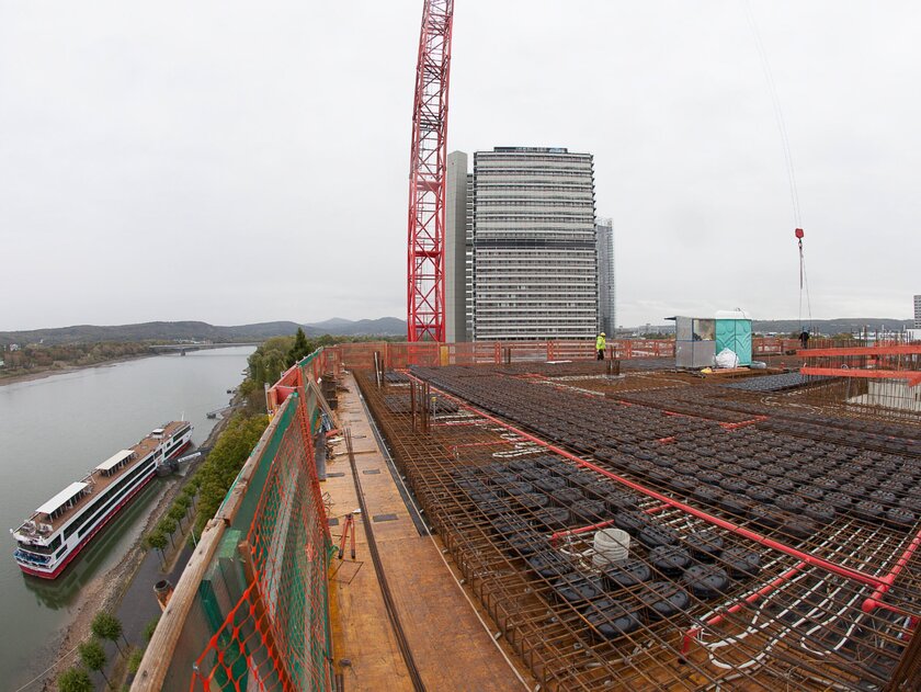 In order to create space for future growth, the Federal Real Estate Agency (Bundesanstalt für Immobilienaufgaben), the owner of the campus that forms the centre of the United Nations organisations in Bonn, had decided to build the new building. Under the direction of the Federal Office for Building and Regional Planning (BBR), a slender high-rise building with 17 upper floors and 3 basement floors was constructed on a footprint of approximately 20 x 30 metres; the 18th floor is a staggered floor that serves the building services. The total costs amount to about 75 million euros. Due to its relatively small footprint, the building, designed by Berlin architect Stefan Lippert, blends in with the existing buildings and encroaches as little as possible on the surrounding green area of the campus. A highlight is the glass outer skin of the office tower, which is interrupted by two-storey conservatories. These provide a connection to the surrounding green space and are used by approximately 330 employees as a place to meet and relax during breaks.