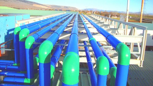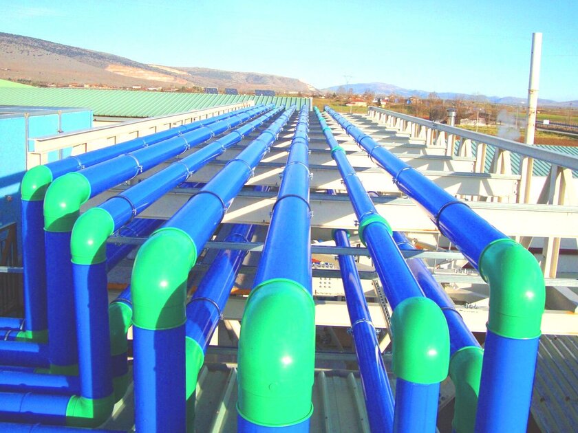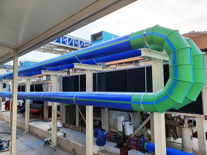 For this reason, Ike Gerasimos Vasilatos and Alexandra Zaxopoulou from GVA Engineers planned a new refrigeration system in which the chillers were connected to a primary circuit and a secondary circuit distribution. The entire piping is made of aquatherm blue ot. The corrosion-resistant piping system made of polypropylene, which has an oxygen barrier, scored points due to the reduced thermal conductivity of the material as well as the very low pipe roughness even after long operation. This feature ensures the protection of the metal parts of the installation and the 25 mm thick foam insulation. aquatherm blue ot was used in dimensions between 50 and 250 mm, and aquatherm blue without additional oxygen barrier was used up to 355 mm outer diameter. Prefabricated manifolds in dimensions up to 500 mm outer diameter accelerated the construction process.
