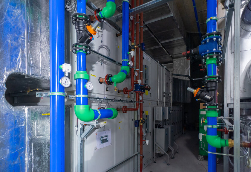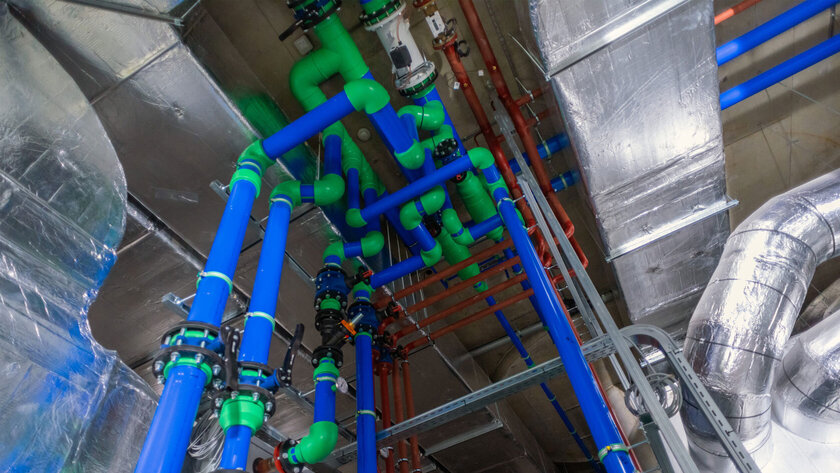 In un edificio progettato per la sostenibilità come il deposito, anche le considerazioni ambientali hanno svolto un ruolo importante nella scelta dei sistemi di tubazioni. Per questo motivo, i progettisti hanno optato per aquatherm blue in polipropilene (PP-R) resistente alla corrosione, per l’impianto di refrigerazione.