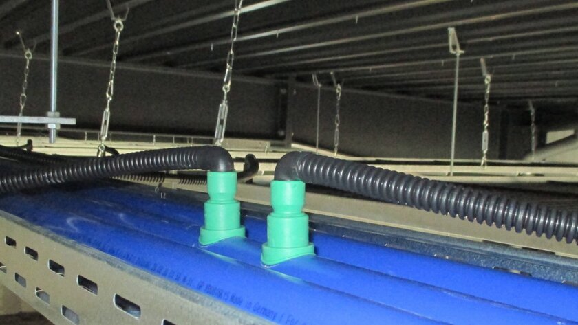 Die Zuleitung zwischen den einzelnen Registern erfolgte mit Hilfe eines Anschlusswellrohres und eines Steckstutzens. Das Wellrohr ermöglicht eine flexible, aber unauffällige Anbindung, während der Schnellsteckverbinder mit Sicherungsclip eine vollkommen dichte, aber dennoch lösbare Verbindung schafft. Die Anbindung des Flächenheiz- und Kühlsystems wurde über Tichelmann-Verteiler aus aquatherm blue-Rohren in der Dimension 50 Millimeter realisiert. aquatherm blue, ebenfalls aus dem Kunststoff Polypropylen gefertigt, ist ein Spezialist für den Transport von kühlenden und heizenden Medien in geschlossenen Systemen und eignet sich deshalb besonders gut für verschiedenste Industrieanwendungen. Die Tichelmann-Verteiler wurden in Kabelkanäle an der Decke eingebracht und im aquatherm Werk vorgefertigt. Die Abgänge wurden senkrecht nach oben in einer Flucht angebracht, so dass die Verbindung schnell und unkompliziert erfolgen konnte.