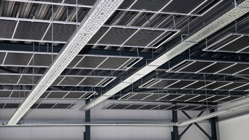 Der Haustechnikgroßhändler entschied sich dafür, aquatherm black sichtbar auf von der mit schwarzem Trapezblech verkleideten Hallendecke abgehängte Stahlrahmen zu montieren. Durch diese Montageart wird eine höhere Effizienz und Reaktionsschnelligkeit als zum Beispiel bei der Montage als Deckensegel oder in einer geschlossenen Decke erzielt, weil neben einem hohen Strahlungsanteil hinsichtlich der Wärmeübertragung auch der konvektive Anteil steigt. Die aquatherm black Register wurden nach Kundenwunsch in einer Größe von 1 x 3,75 m im Hauptwerk der Unternehmensgruppe aquatherm objektspezifisch produziert und in insgesamt 35 Stahlrahmen eingebracht. Für die ausführende Firma Börger aus Lennestadt, die seit über 20 Jahren aquatherm Produkte verarbeitet, war es das erste Projekt mit dieser Montageart.
