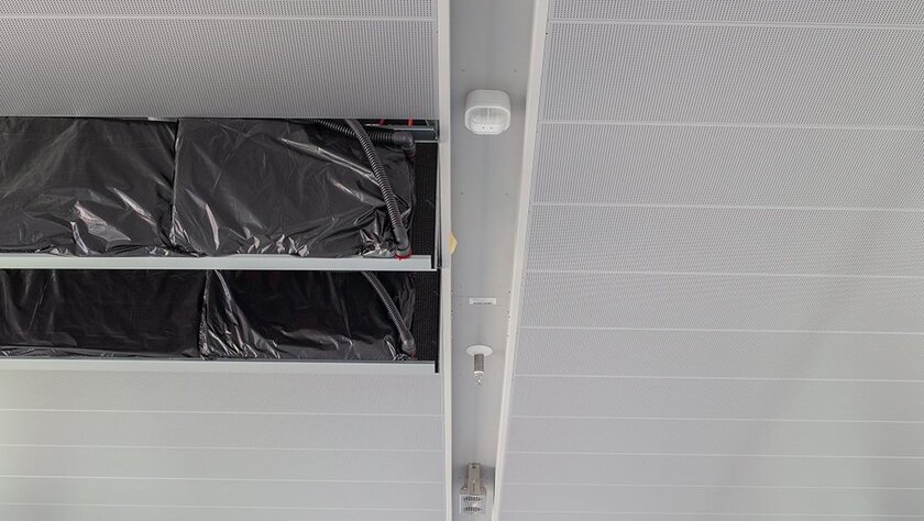 Deshalb war er auf der Suche nach einem effektiven Kühlsystem, das die gesamten Anforderungen im Bereich der Kühlung abdecken kann. Im Rahmen von früheren Bauvorhaben, zum Beispiel der Wohnanlage HUF City Living in Montabaur und der Sanierung der Feuerwehr-Leitwache des Flughafens Köln/Bonn, hatte er das Flächenheiz- und Kühlsystem aquatherm black kennen und schätzen gelernt. Deshalb entschied er sich bei dem neuen Verbindungsgang ebenfalls für das Produkt aus dem Hause aquatherm, das in eine gelochte Metallkassettendecke installiert und an ein bereits bestehendes Fernkältenetz angeschlossen wurde.