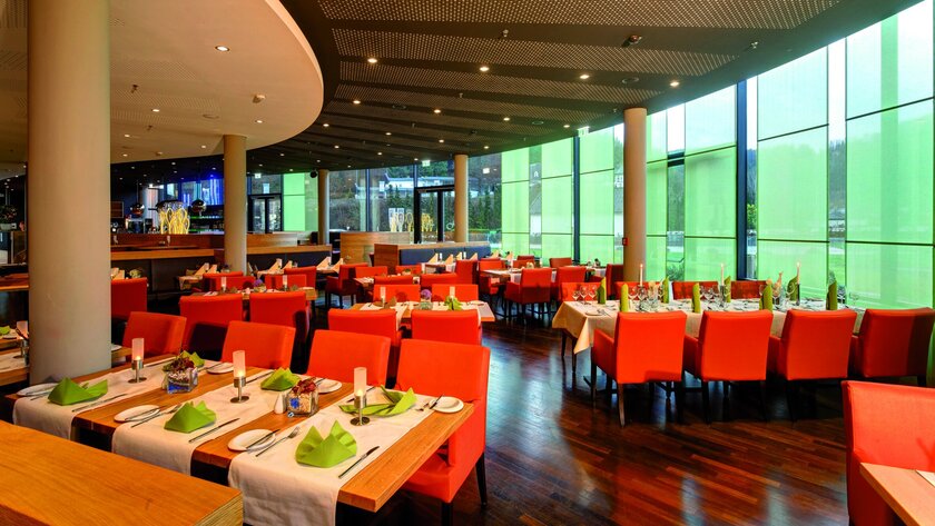 Im Erdgeschoss ist neben dem Empfangsbereich ein Restaurant mit internationaler Küche untergebracht. Letzteres lädt zur kulinarischen Weltreise ein und ist auch für Nicht-Hotelgäste geöffnet - ebenso wie zu späterer Stunde die Tanzbar. Neue Energie können die Gäste am nächsten Tag tanken: Die Saunalandschaft mit zwei Saunen, Dampfbad, Infrarot-Kabine, Salz-Ruheraum, Wärmebänken und einem Außenbereich auf der Dachterrasse des Hotels bietet den idealen Rahmen, um nach einem ereignisreichen Tag in Ruhe zu entspannen. Ein Fitnessbereich sowie ein Biergartenmit 150 Plätzen runden das Angebot ab.