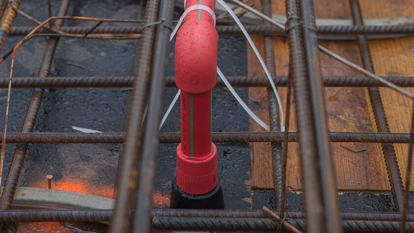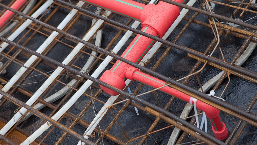 Die Verlegung in Beton wird durch das besondere Material ermöglicht: aquatherm red besteht aus dem Kunststoff Polypropylen, konkret aus dem von aquatherm entwickelten Werkstoff fusiolen® PP-R FS. Dieser bietet durch seine schwerentflammbaren Eigenschaften (Baustoffklasse B1) und seine Korrosionsbeständigkeit eine hohe Sicherheit.  Zum Vergleich: Metallene Sprinklersysteme können nur unter Verwendung von speziellen Schutzmaßnahmen in Beton verlegt werden. Grund dafür ist Korrosion, die unweigerlich auftritt, wenn Metall und feuchter Beton aufeinandertreffen. Der spezielle Schutz von metallenen Rohrsystemen macht die Verlegung in Beton aufwändig und teuer.