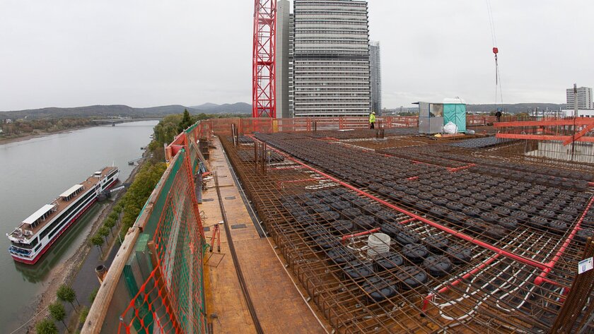 Für den Neubau auf dem UN Campus wurde ein Sprinklersystem gesucht, das direkt in den Beton der Geschossdecken in einer Hohlkörperdecke verlegt werden kann.